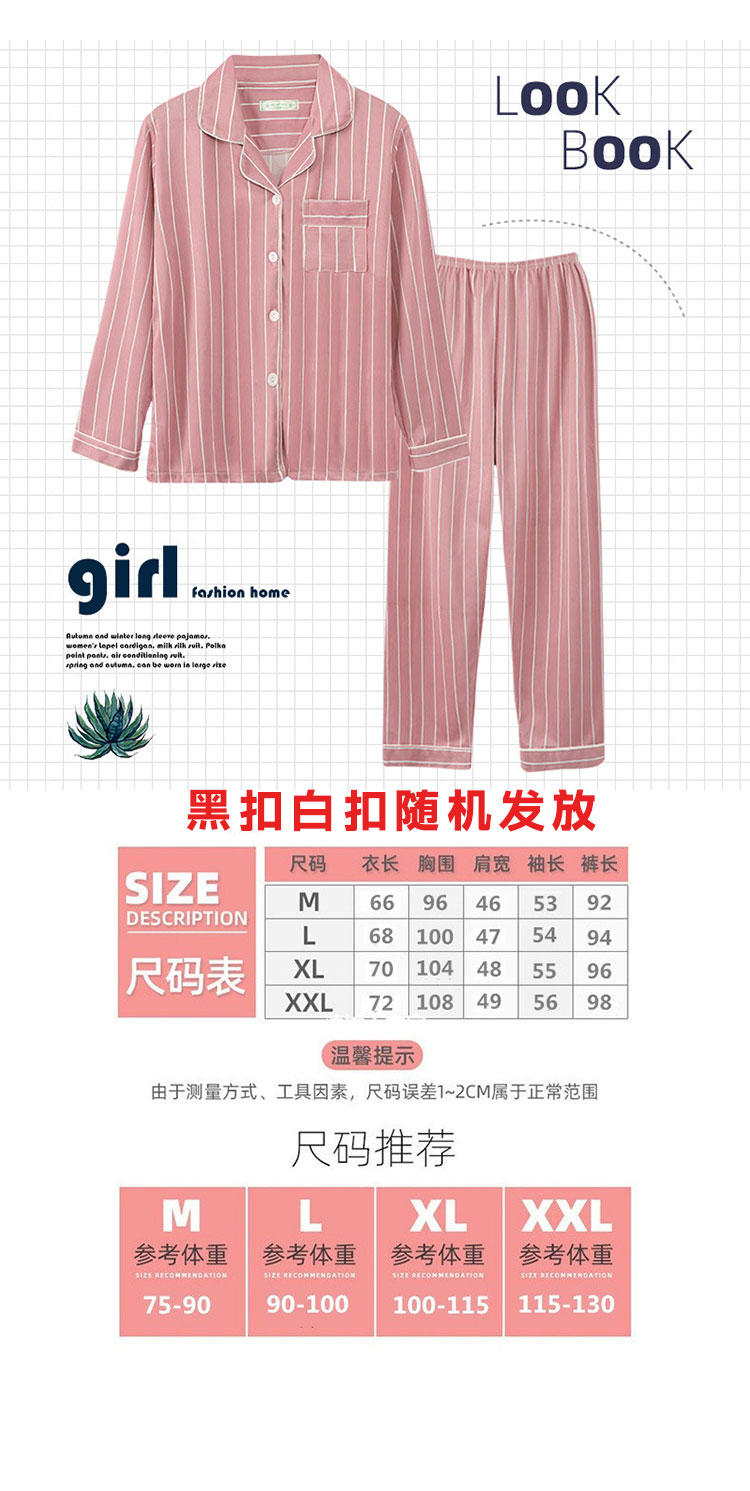 睡衣女秋冬女士长袖家居服春季开衫套装(豆沙白条L码)