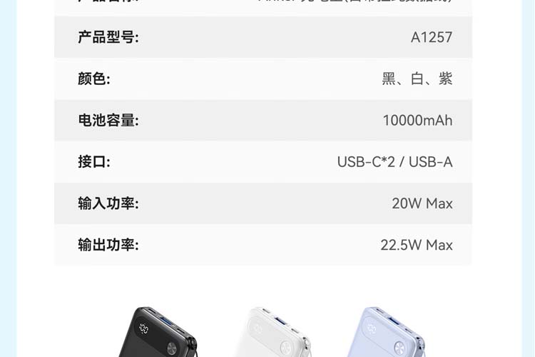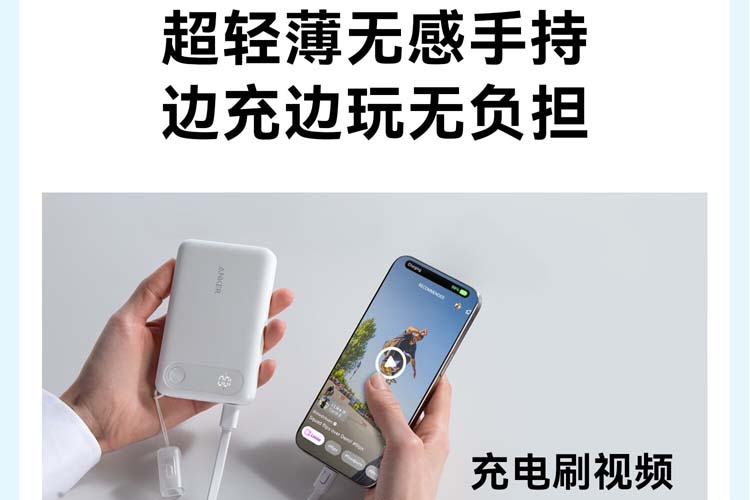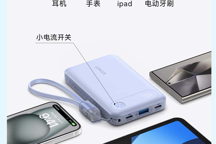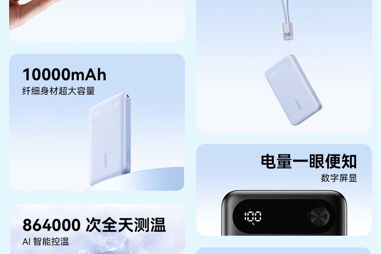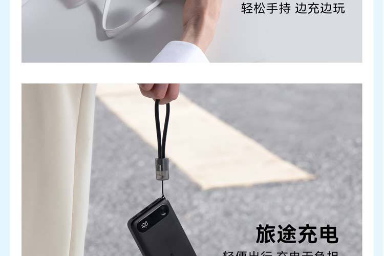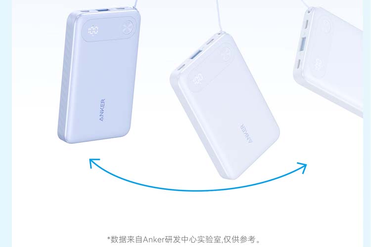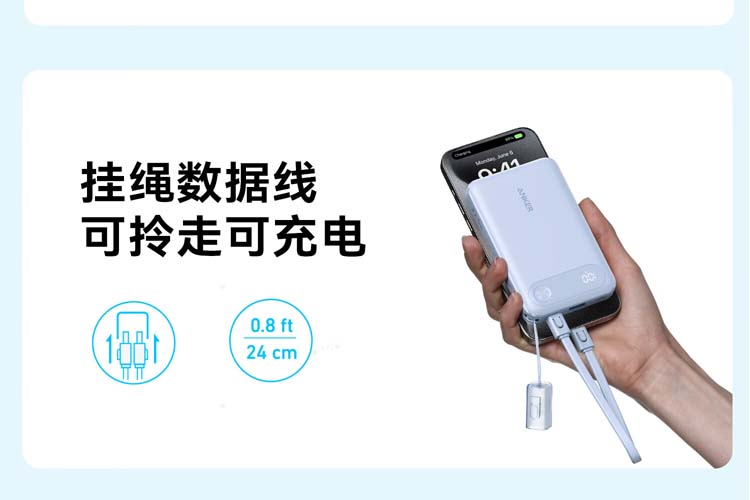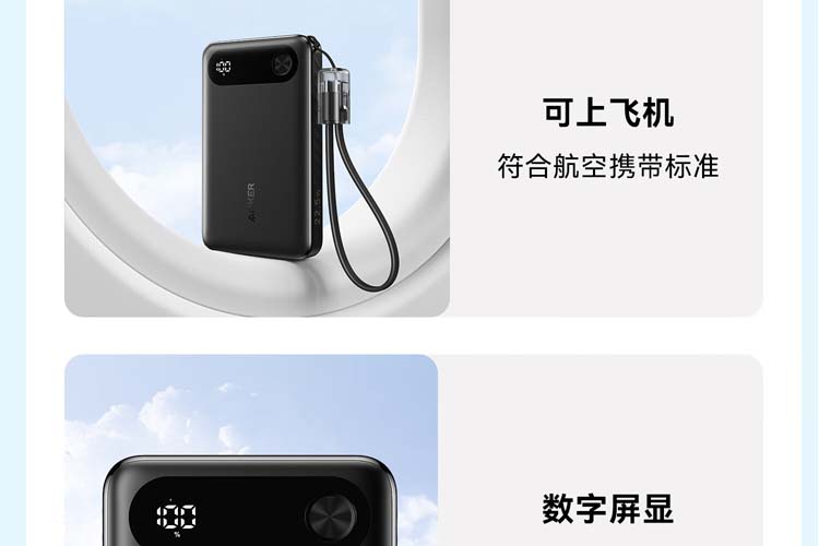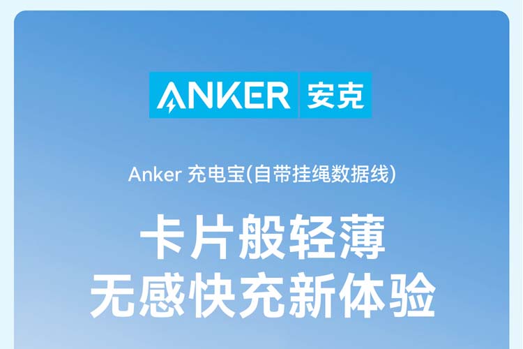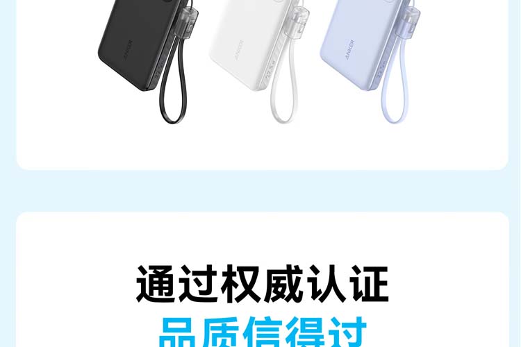 安克 10000毫安时 自带线充电宝 大容量移动电源挂绳数据线轻薄小巧可上飞机 A1257黑色